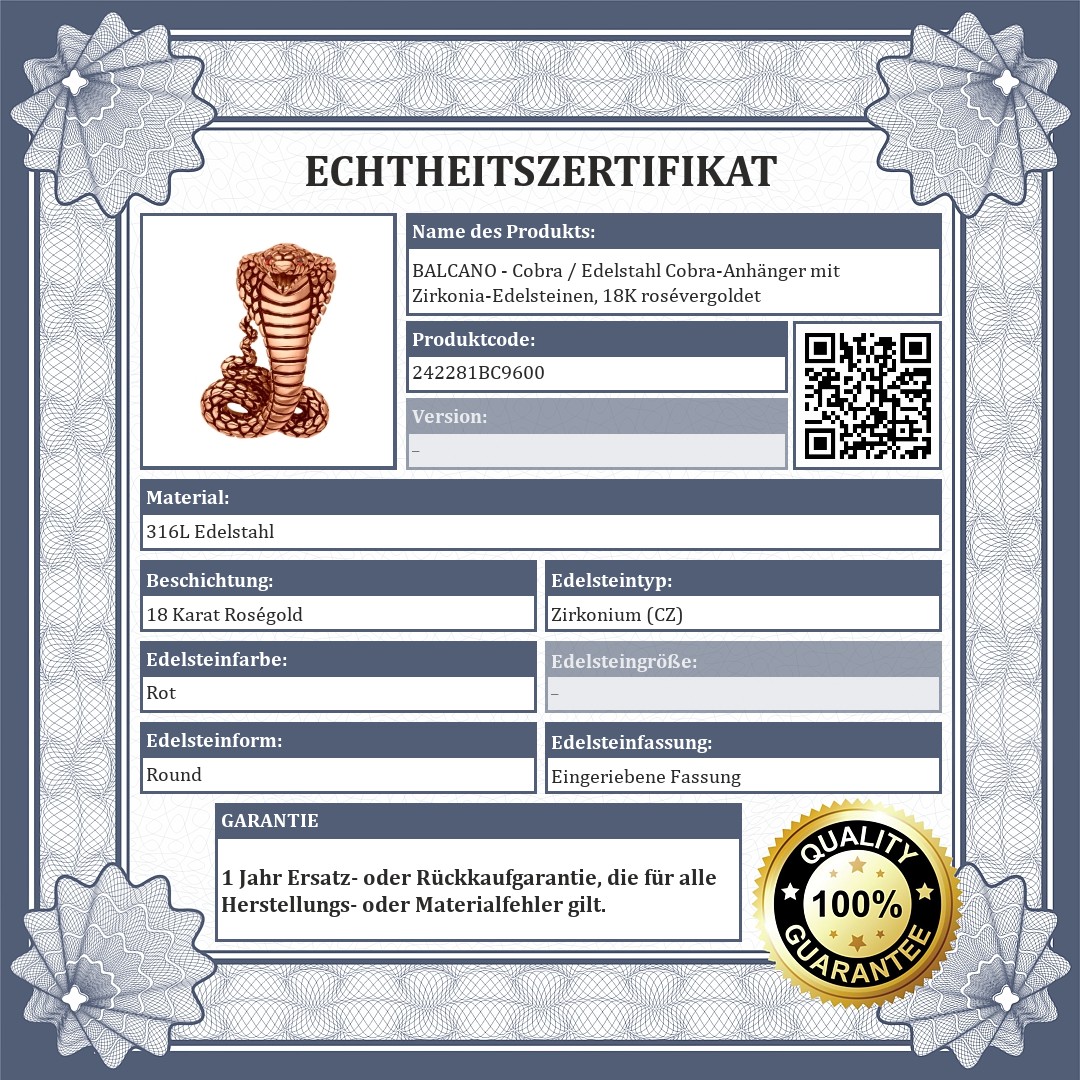 Das Material ist antiallergisch, abriebfest und nicht scheuernd. Die Augen der Kobra sind aus roten Zirkonia-Edelsteinen gefertigt.