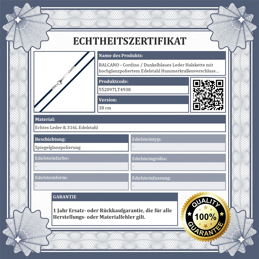 BALCANO - Cordino / Dunkelblaues Leder Halskette mit hochglanzpoliertem Edelstahl Hummerkrallenverschluss - 2 mm