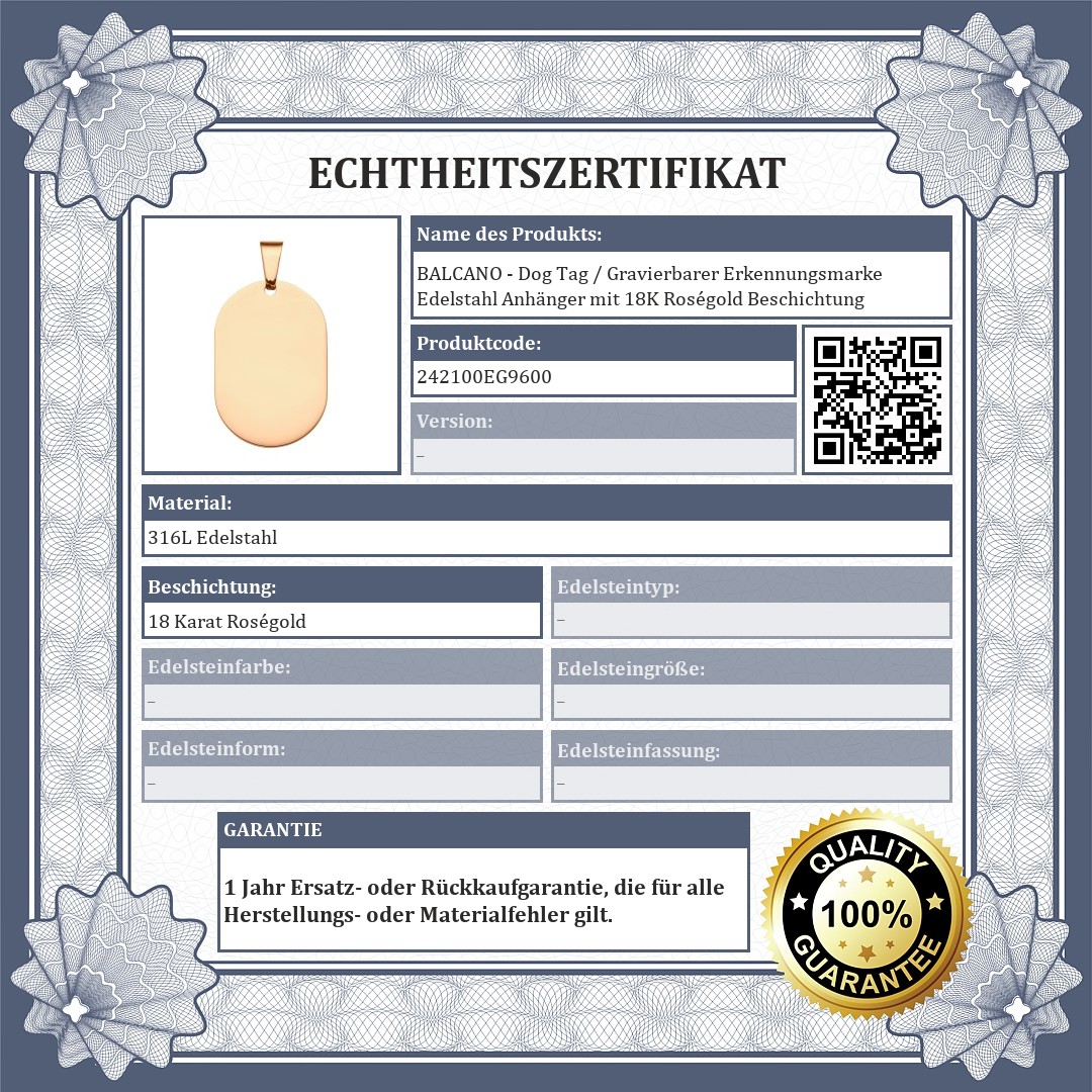 BALCANO - Dog Tag / Gravierbarer Erkennungsmarke Edelstahl Anhänger mit 18K Roségold Beschichtung