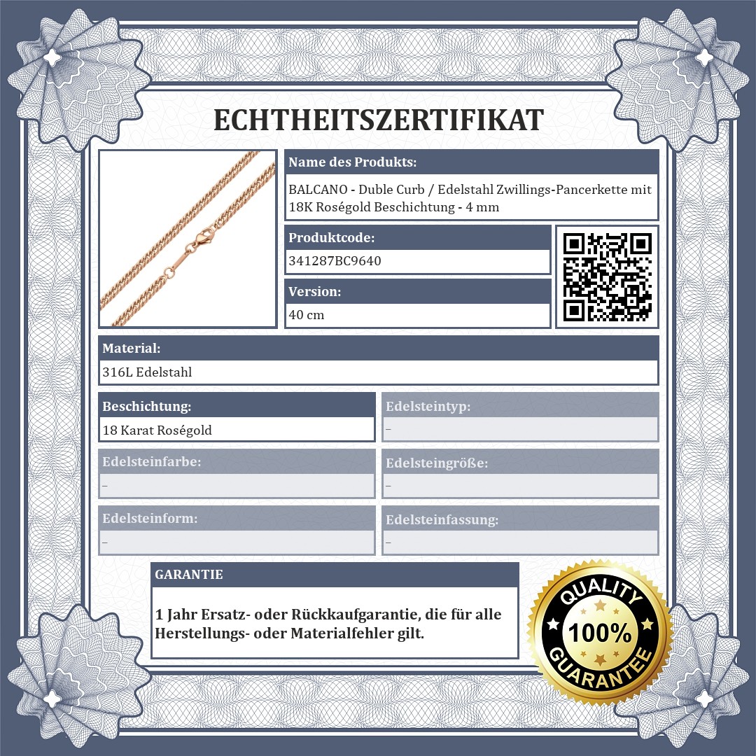 Hochwertige, antiallergische, Zwilling-Pancerkette von 316L-Edelstahl mit 18K Roségoldbeschichtung. Aufgrund seines Materials nutzt es sich während des gebrauchs nicht ab, rostet oder mattiert nicht.