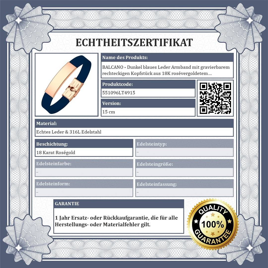 BALCANO - Dunkel blaues Leder Armband mit gravierbarem rechteckigen Kopfstück aus 18K rosévergoldetem Edelstahl