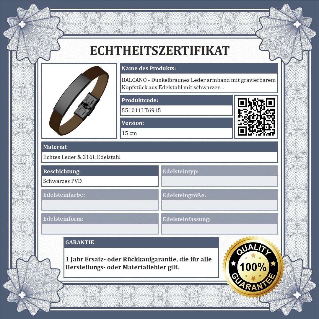 BALCANO - Dunkelbraunes Leder armband mit gravierbarem Kopfstück aus Edelstahl mit schwarzer PVD-Beschichtung
