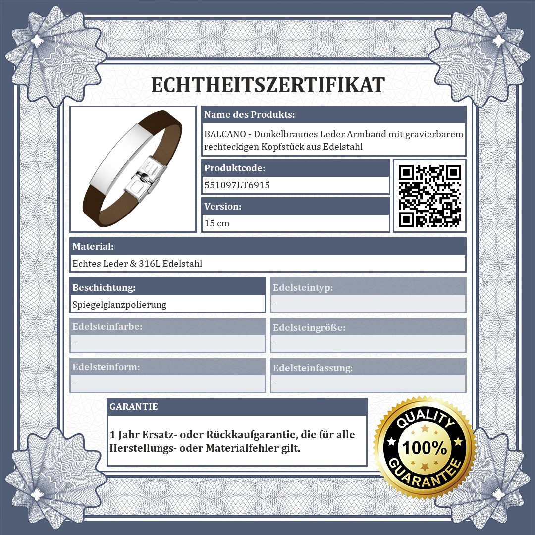 BALCANO - Dunkelbraunes Leder Armband mit gravierbarem rechteckigen Kopfstück aus Edelstahl