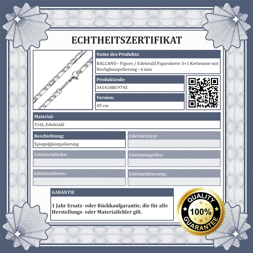 BALCANO - Figaro / Edelstahl Figarokette 3+1 Kettenöse mit Hochglanzpolierung - 6 mm