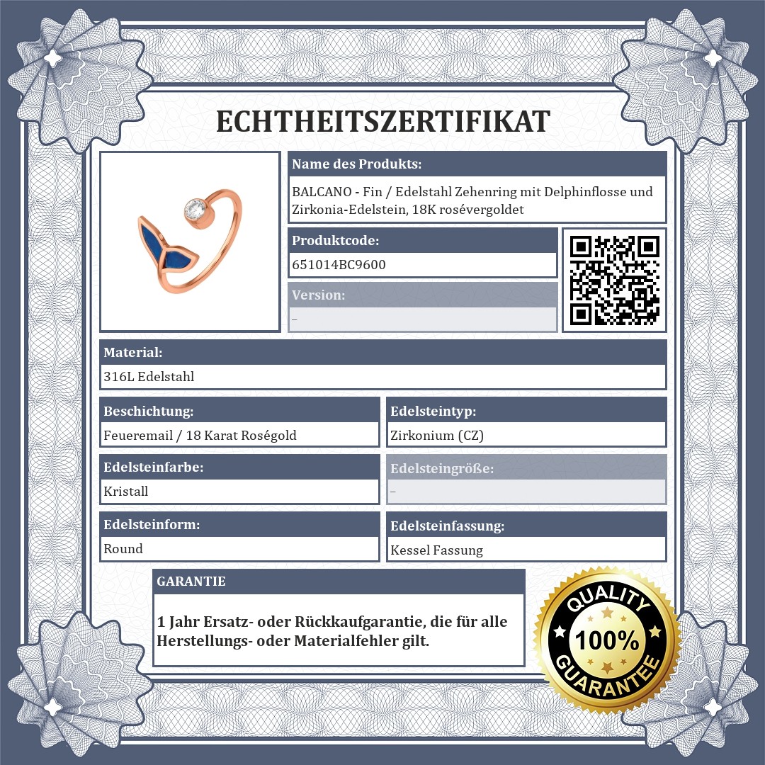 BALCANO - Fin / Edelstahl Zehenring mit Delphinflosse und Zirkonia-Edelstein, 18K rosévergoldet