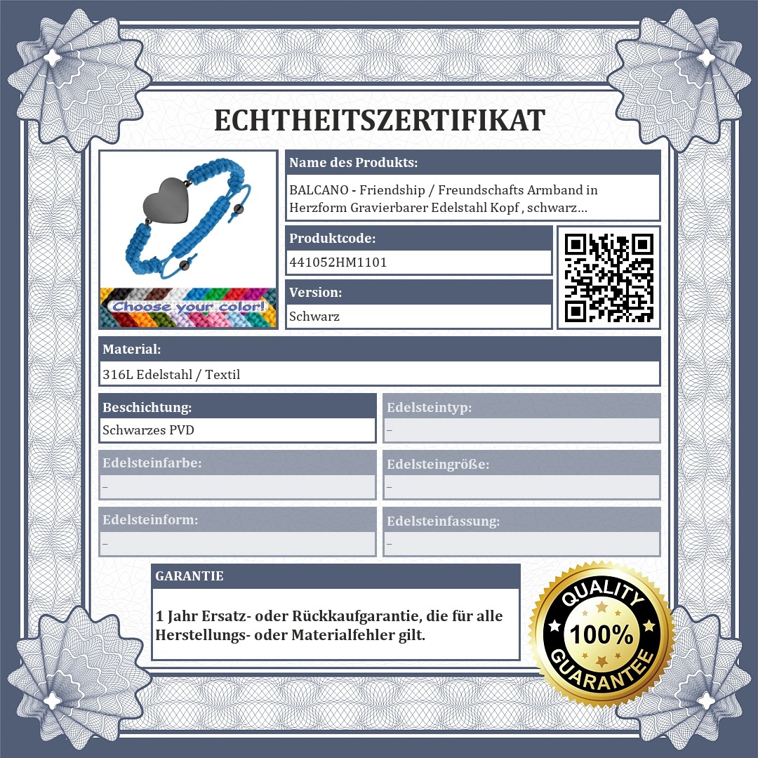 Handgefertigtes, verstellbares Armband. Das Material ist extrem robust und für den Alltag geeignet. Das Armband aus geflochtenem Polyestermaterial ist mit einem herzförmigen 316L-Edelstahl Kopfstück mit glatter, gravierbarer Oberfläche und schwarzem PVD-Beschichtung.