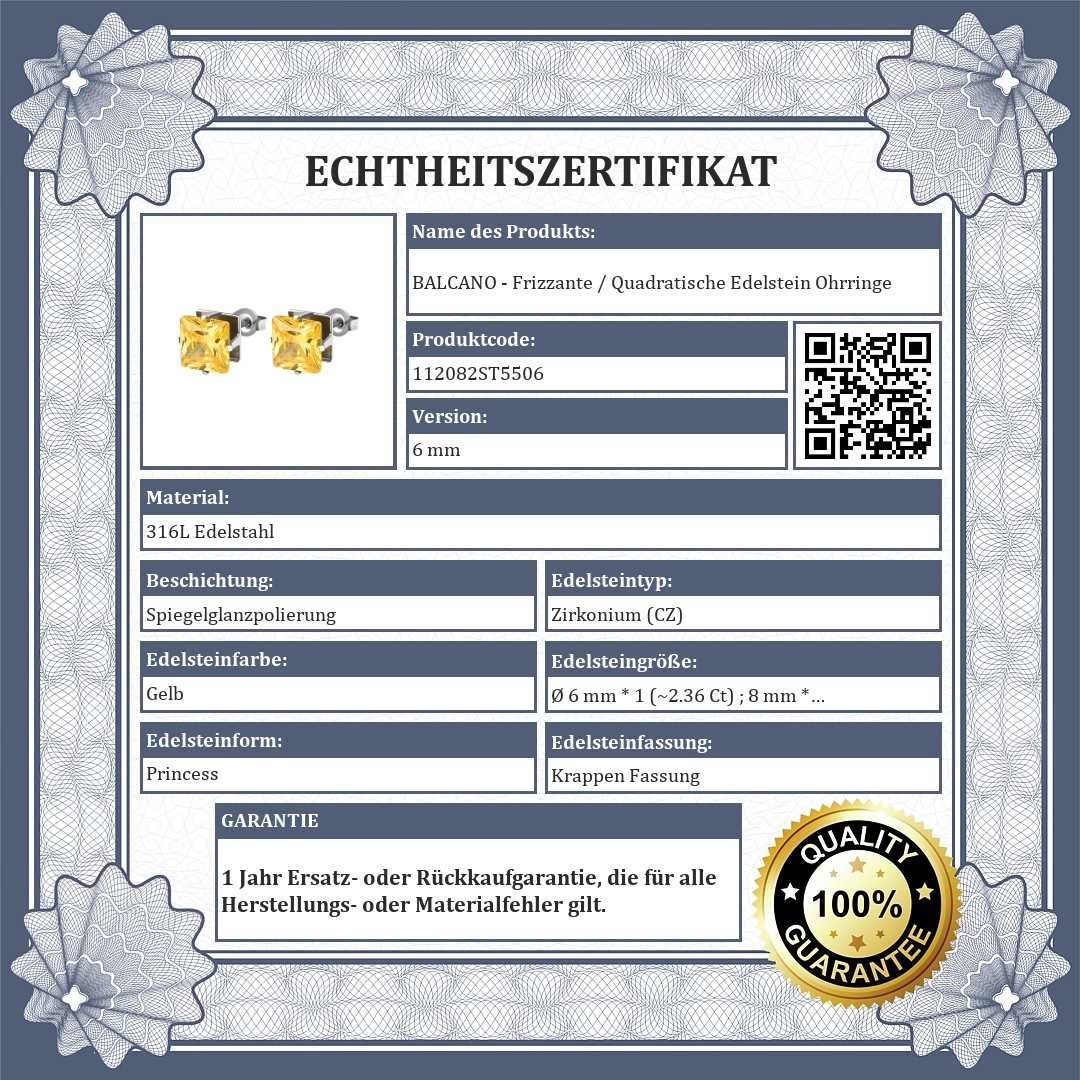 Goldgelbe Farbe Ohrringe mit quadratischem Zirkonia Edelstein in den Größen 6 mm und 8 mm. Schmuck aus medizinischem 316L-Edelstahl, der sich aufgrund seines Materials nicht abnutzt oder verfärbt.