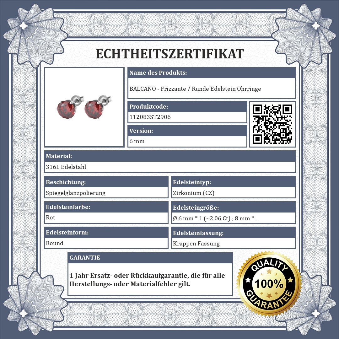 Granatrote Farbe Ohrringe mit runden Zirkonia Edelstein in den Größen 6 mm und 8 mm. Schmuck aus medizinischem 316L-Edelstahl, der sich aufgrund seines Materials nicht abnutzt oder verfärbt.