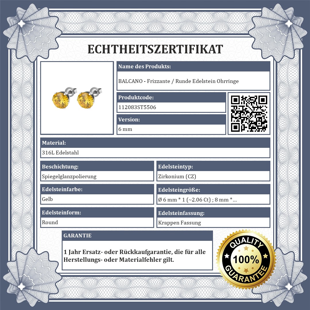 Goldgelbe Farbe Ohrringe mit runden Zirkonia Edelstein in den Größen 6 mm und 8 mm. Schmuck aus medizinischem 316L-Edelstahl, der sich aufgrund seines Materials nicht abnutzt oder verfärbt.