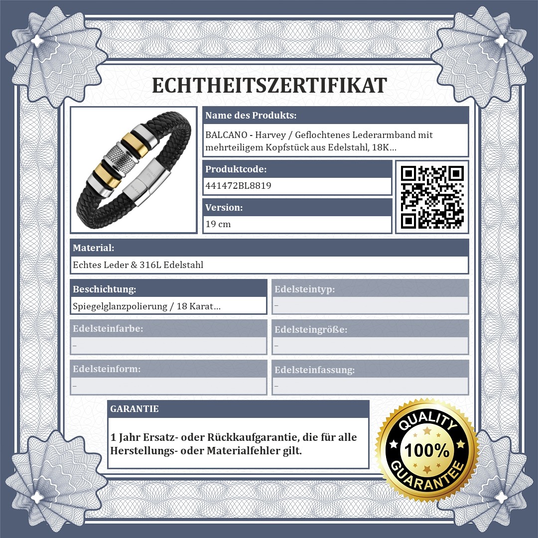 BALCANO - Harvey / Geflochtenes Lederarmband mit mehrteiligem Kopfstück aus Edelstahl, 18K vergoldet