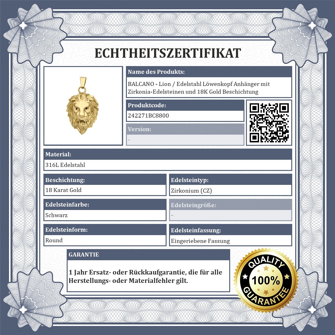 BALCANO - Lion / Edelstahl Löwenkopf Anhänger mit Zirkonia-Edelsteinen und 18K Gold Beschichtung
