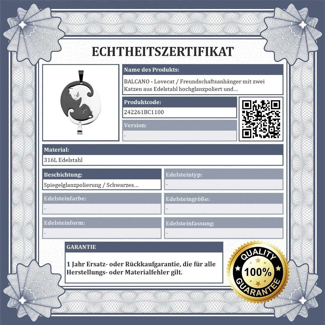 Freundschafts- oder Liebesanhänger bestehend aus zwei zueinander passenden Katzen. Wählen Sie eine Hälfte für sich selbst und die andere Hälfte als Geschenk für einen Freund oder eine geliebte Person. Schmuck aus medizinischem 316L-Edelstahl mit Hochglanzpolierung und schwarzer PVD-Beschichtung. Das Material ist antiallergisch, abriebfest und verschleißfrei.