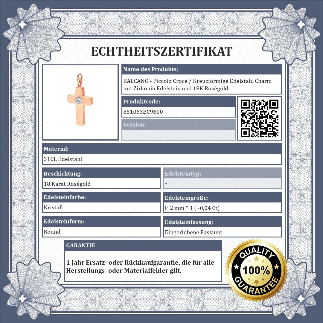 BALCANO - Piccolo Croce / Kreuzförmige Edelstahl Charm mit Zirkonia Edelstein und 18K Roségold Beschichtung