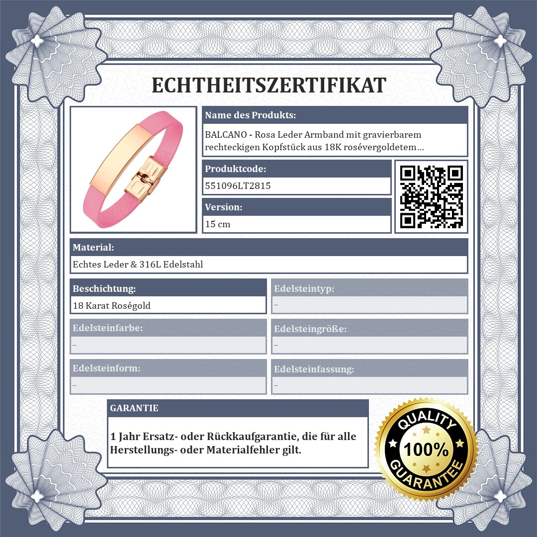 BALCANO - Rosa Leder Armband mit gravierbarem rechteckigen Kopfstück aus 18K rosévergoldetem Edelstahl