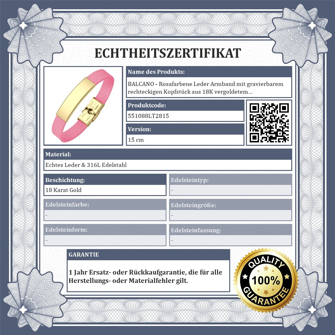 BALCANO - Rosafarbene Leder Armband mit gravierbarem rechteckigen Kopfstück aus 18K vergoldetem Edelstahl