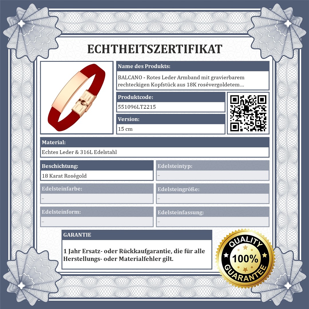 BALCANO - Rotes Leder Armband mit gravierbarem rechteckigen Kopfstück aus 18K rosévergoldetem Edelstahl
