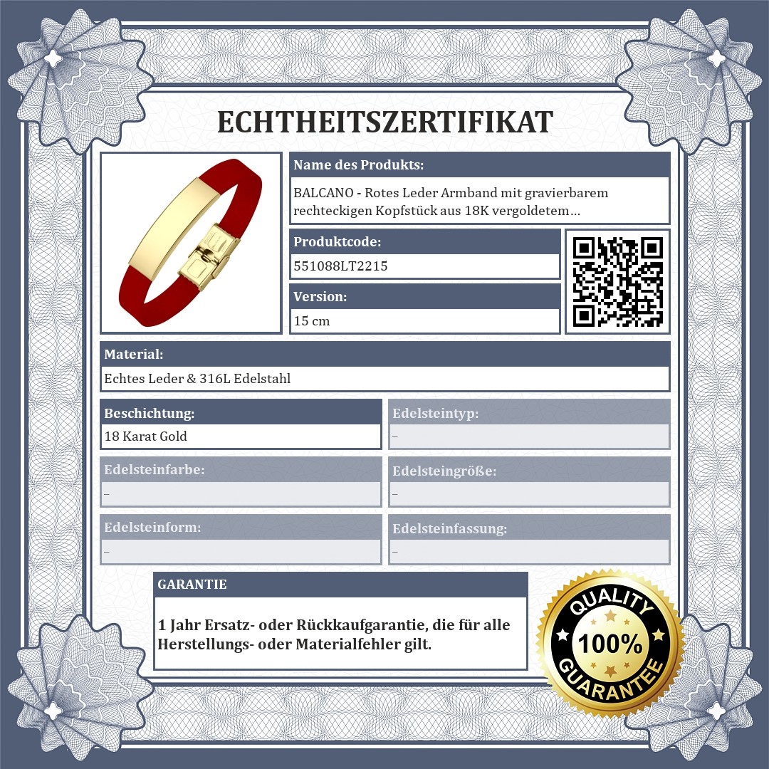 BALCANO - Rotes Leder Armband mit gravierbarem rechteckigen Kopfstück aus 18K vergoldetem Edelstahl
