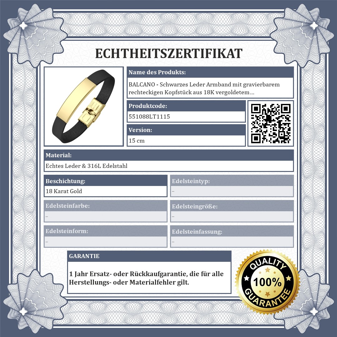 BALCANO - Schwarzes Leder Armband mit gravierbarem rechteckigen Kopfstück aus 18K vergoldetem Edelstahl