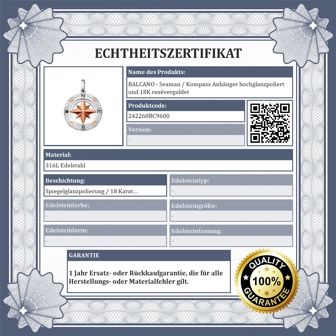 BALCANO - Seaman / Kompass Anhänger hochglanzpoliert und 18K rosévergoldet