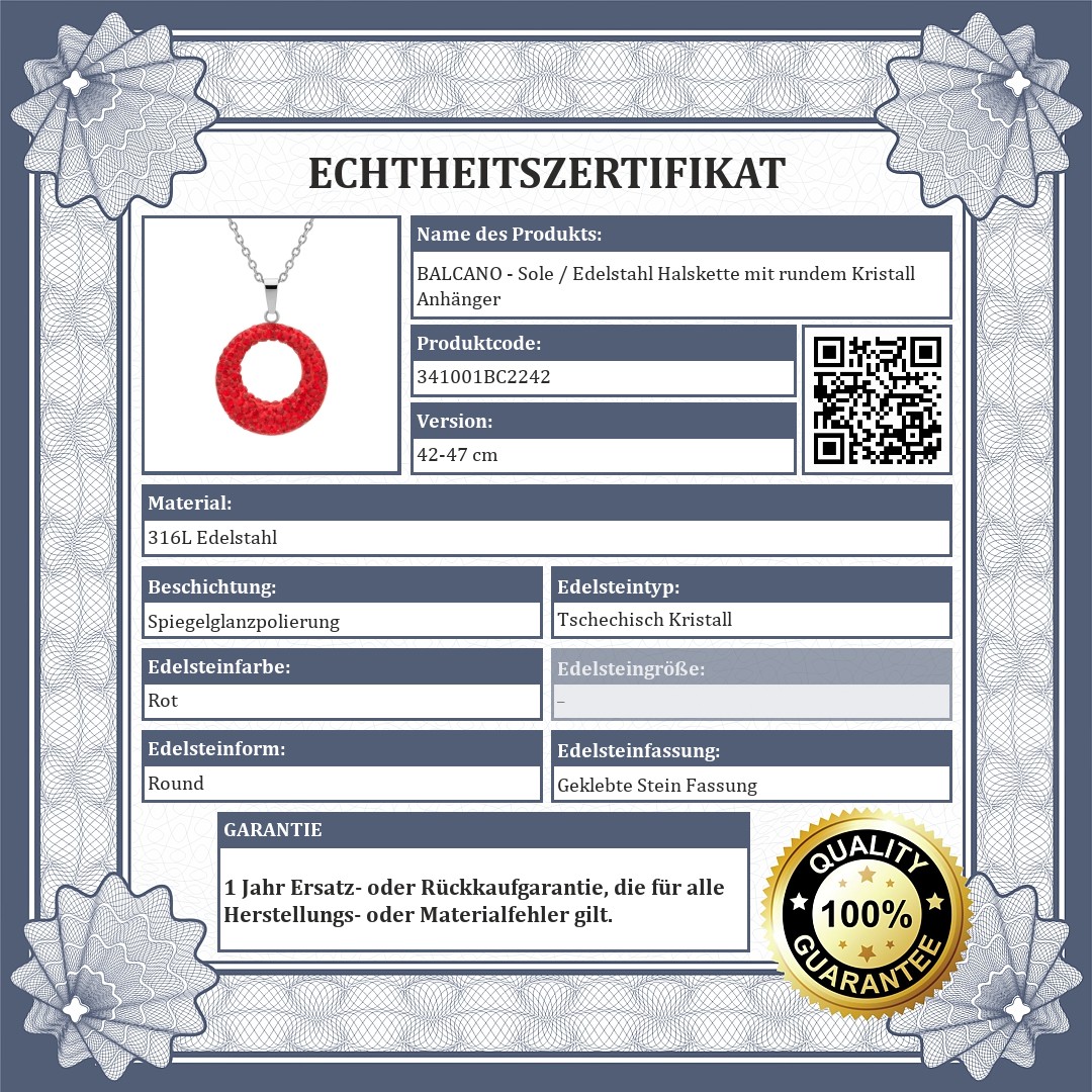 Flache Ankerkette mit verstellbarer größe und einem runden Anhänger, der mit roten tschechischen Kristallen besetzt ist. Medizinischer 316L-Edelstahl schmuck, der aufgrund seines materials extrem langlebig ist, sich nicht abnutzt und sich nicht verfärbt.