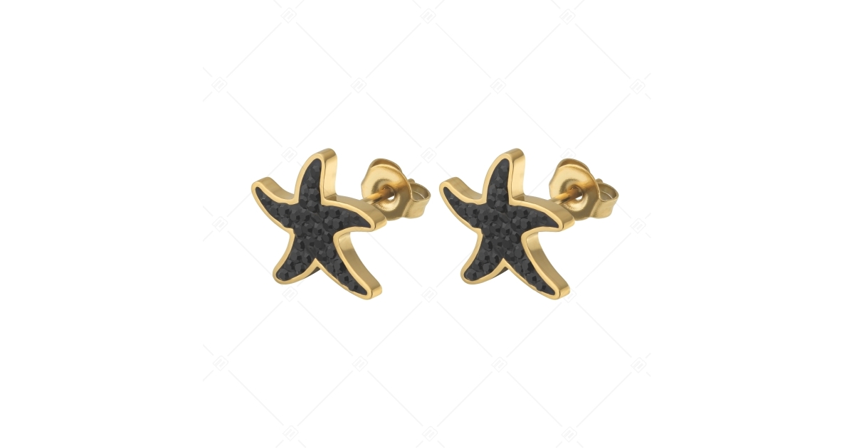 Trendige Ohrstecker in Form eines fröhlichen Seesterns. Hergestellt aus 18K vergoldetem, antiallergischem medizinischer 316L-Edelstahl Schmuck. Hochwertiges Zubehör mit glänzenden schwarzen tschechischen Kristallen.