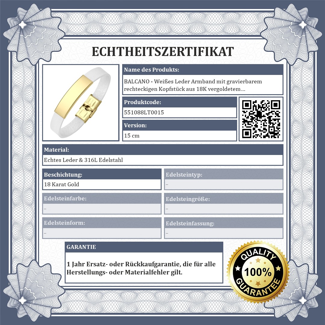 BALCANO - Weißes Leder Armband mit gravierbarem rechteckigen Kopfstück aus 18K vergoldetem Edelstahl