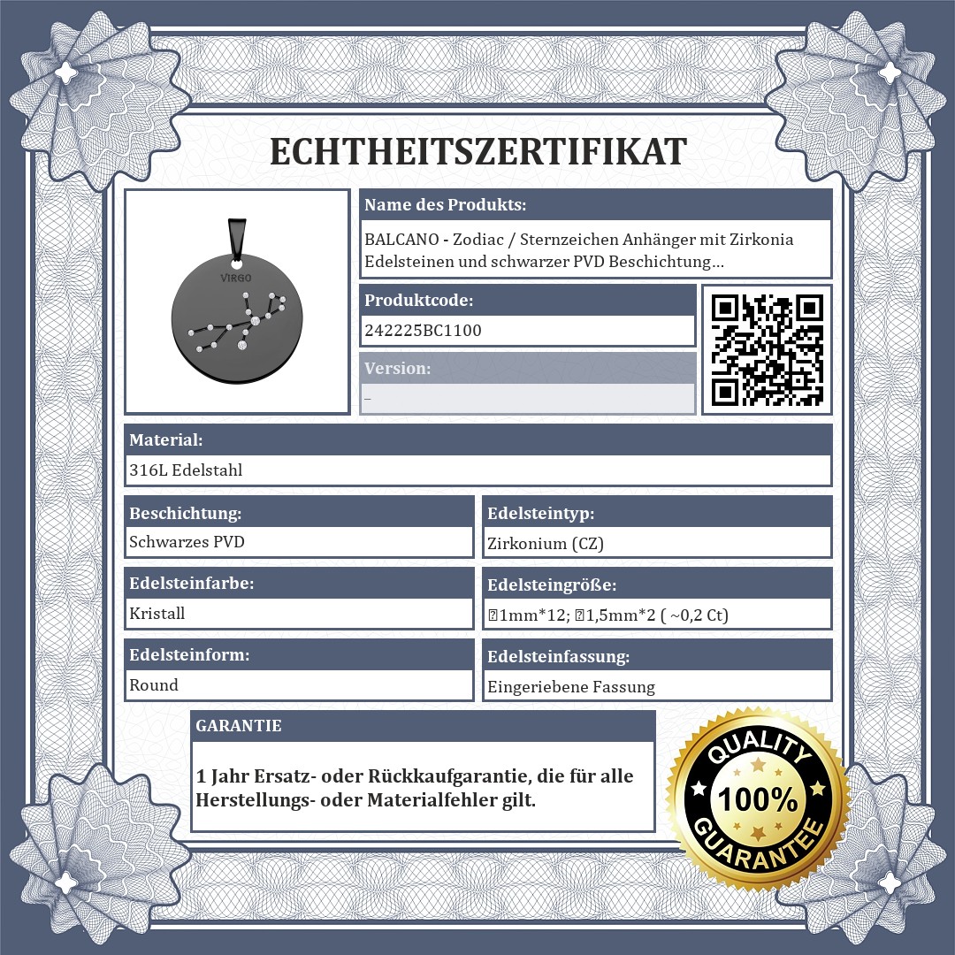 BALCANO - Zodiac / Sternzeichen Anhänger mit Zirkonia Edelsteinen und schwarzer PVD Beschichtung - Jungfrau