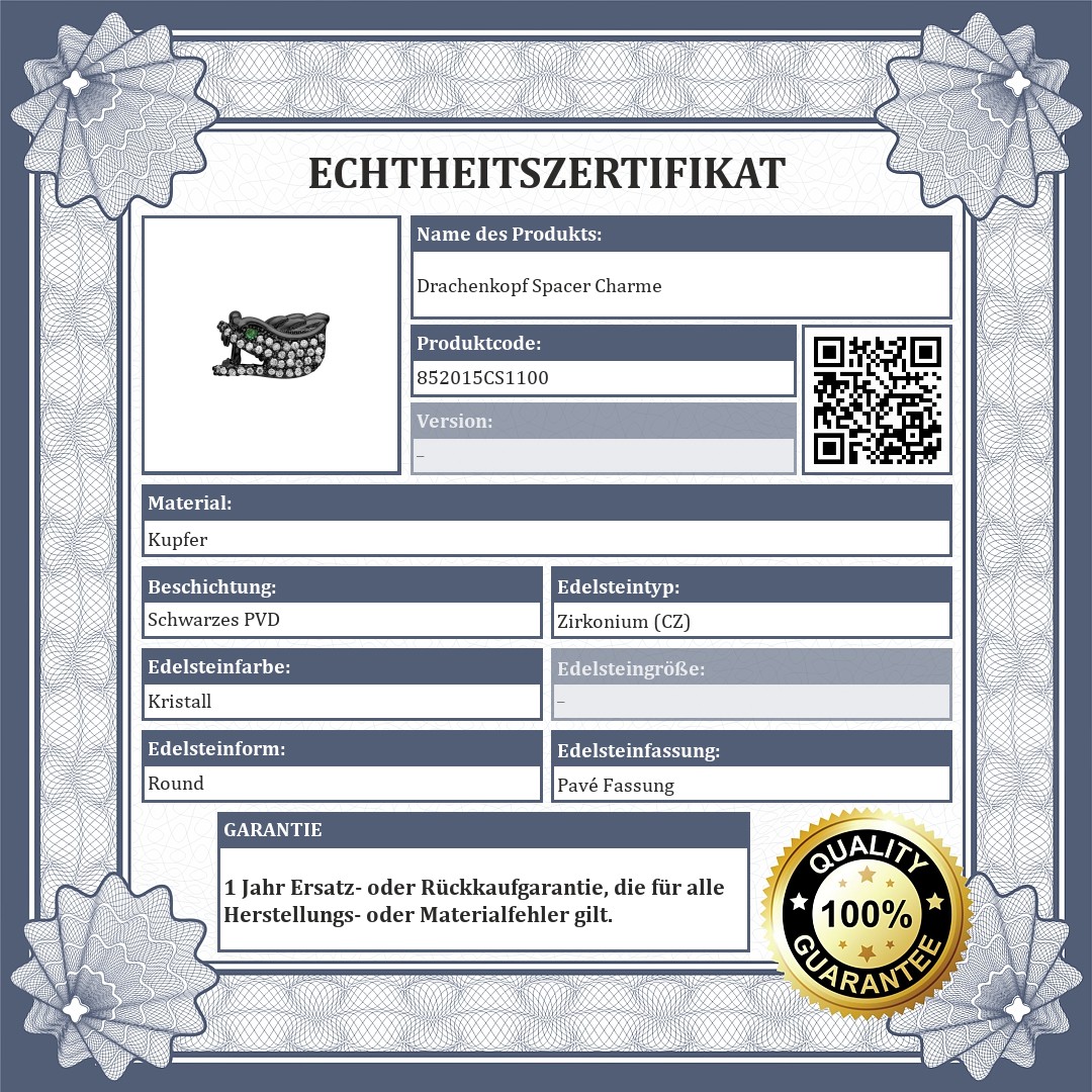 Drachenkopf Form Spacer Charme . Hergestellt aus Kupfer, schwarz verchromt und PVD-beschichtet. Besetzt mit glitzernden klaren und grünen Zirkonia Edelsteinen. Spacer verhindern, dass andere Charmes und Perlen auf dem Armband verrutschen.