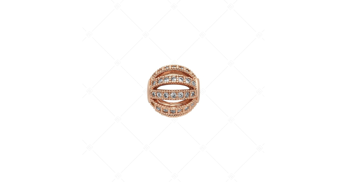 Hohler, kugelförmiger Spacer Charme. Speziell entworfenes Zubehör mit klaren Zirkonia Kristallen rundherum. Hergestellt aus Kupfer, überzogen mit 18K Roségold. Die Spacer sorgen dafür, dass Ihre Charmes und Perlen nicht vom Armband rutschen.