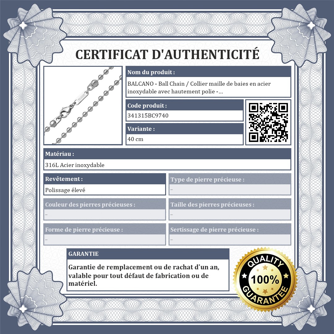 BALCANO - Ball Chain / Collier maille de baies en acier inoxydable avec hautement polie - 3 mm