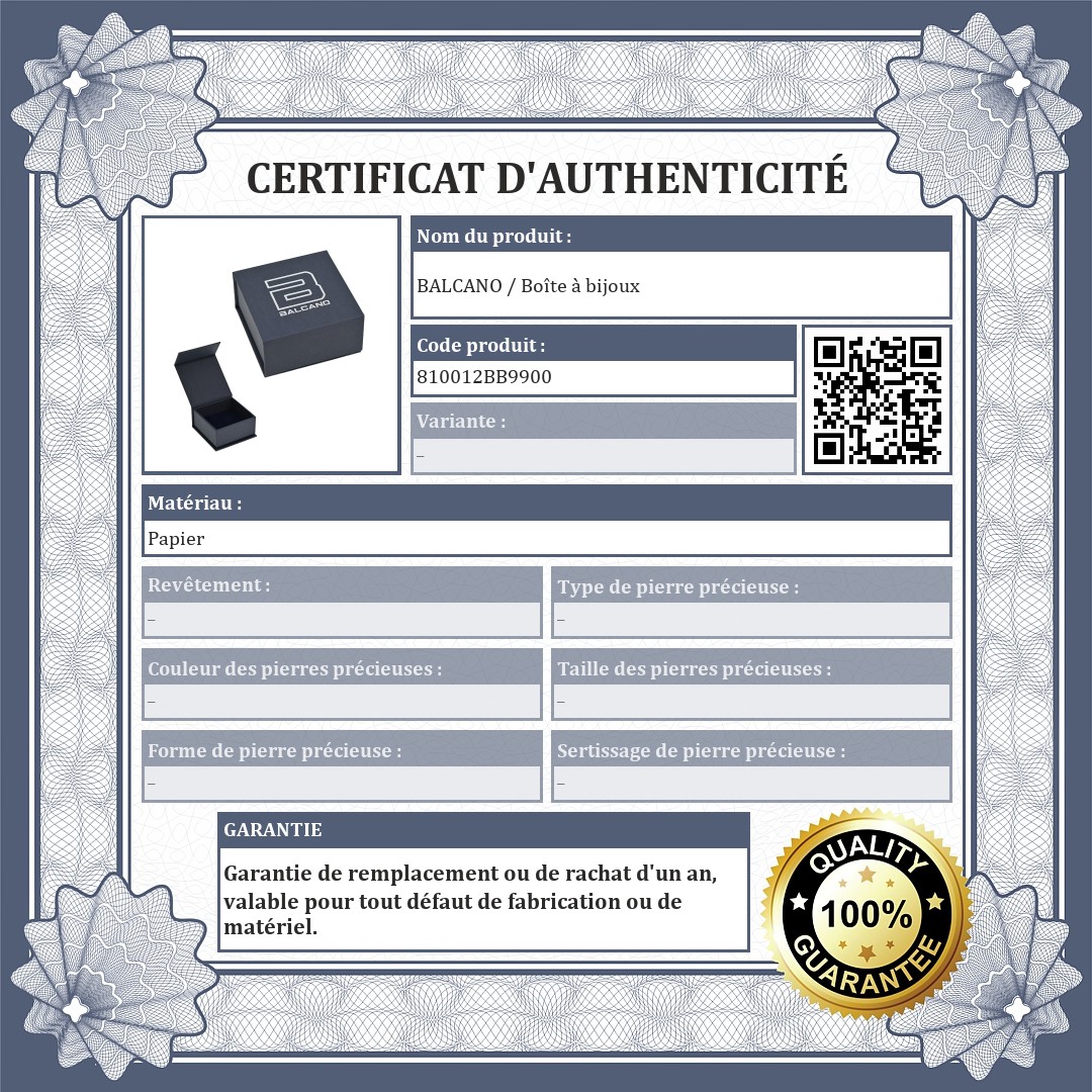 Boîte à bijoux à fermeture magnétique de haute qualité avec le logo BALCANO argenté sur le couvercle et un insert en éponge grise avec un revêtement en velours bleu marine. Dimensions intérieures 65 x 65 mm. Elle convient pour le rangement sûr et esthétique de boucles d'oreilles, colliers et pendentifs. Disponible en tant que boîte cadeau seule ou avec un emballage cadeau individuel.