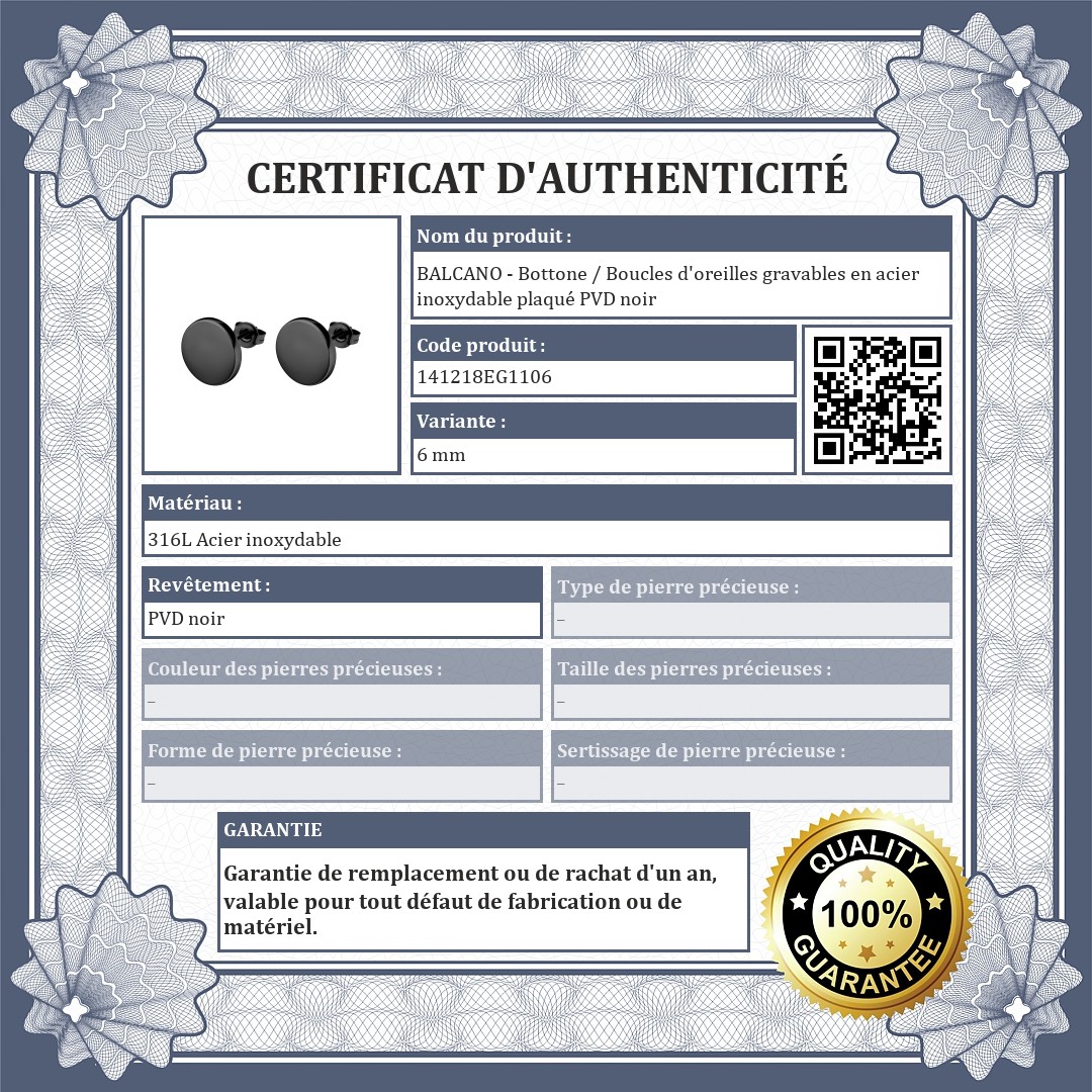 BALCANO - Bottone / Boucles d'oreilles gravables en acier inoxydable plaqué PVD noir