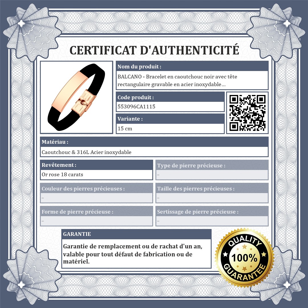 BALCANO - Bracelet en caoutchouc noir avec tête rectangulaire gravable en acier inoxydable plaqué or rose 18K