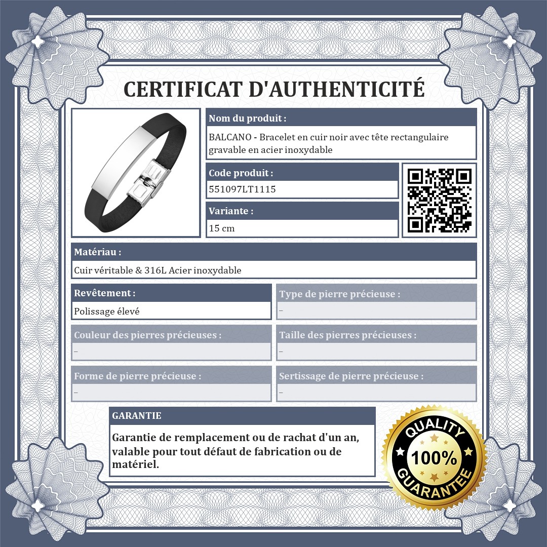 BALCANO - Bracelet en cuir noir avec tête rectangulaire gravable en acier inoxydable
