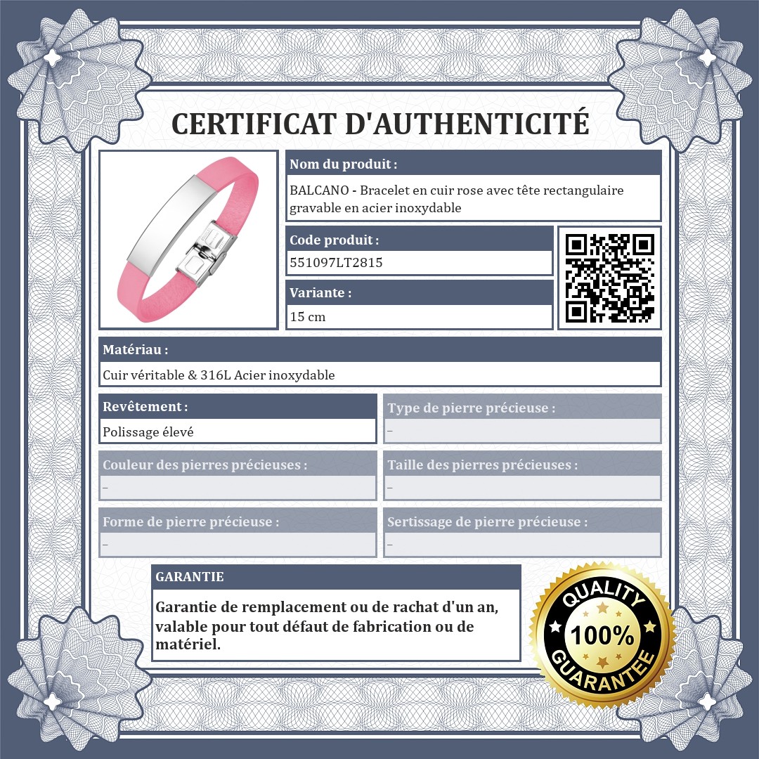 BALCANO - Bracelet en cuir rose avec tête rectangulaire gravable en acier inoxydable