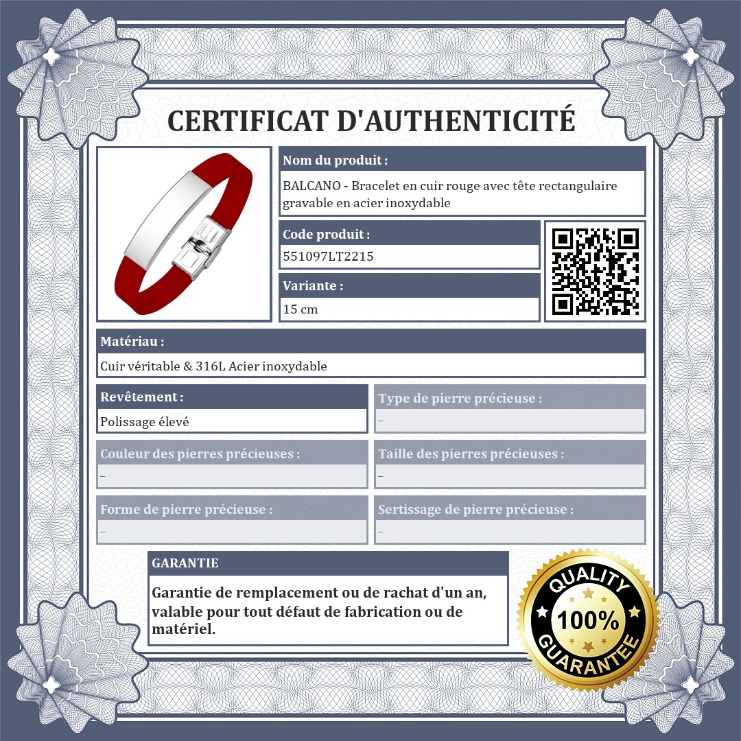 BALCANO - Bracelet en cuir rouge avec tête rectangulaire gravable en acier inoxydable