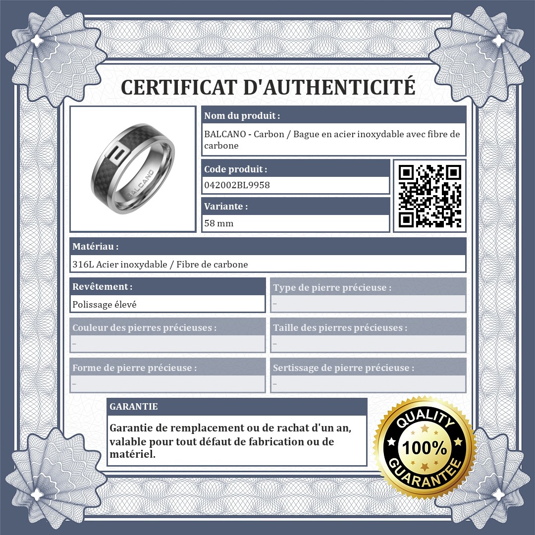Bague en acier inoxydable antiallergique et hautement polie. Ce bijou unique et à la mode est décoré d'une incrustation en carbone noir (tissu en fibre de carbone) au centre, avec le logo BALCANO sur une finition mate.