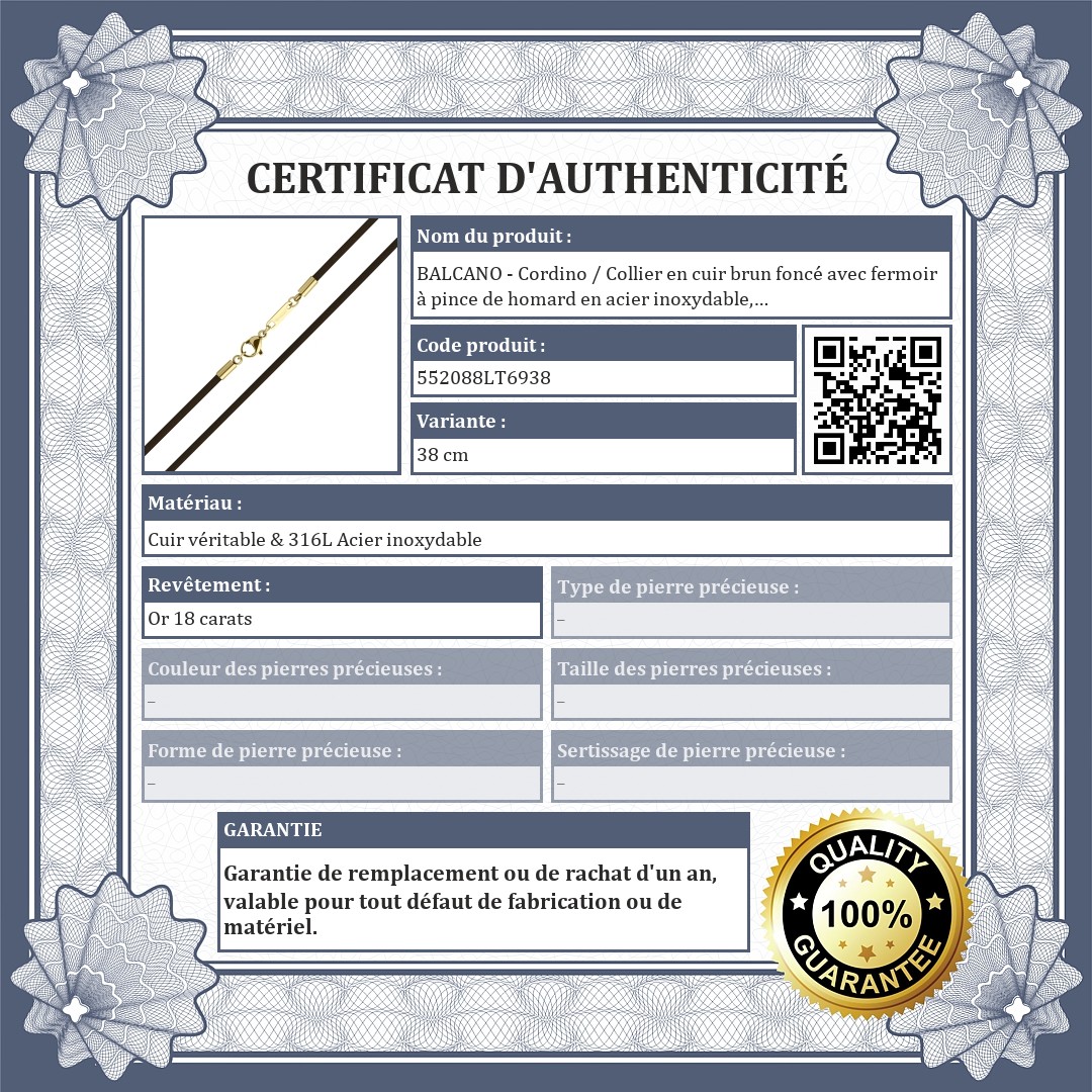 BALCANO - Cordino / Collier en cuir brun foncé avec fermoir à pince de homard en acier inoxydable, plaqué or 18K - 2 mm