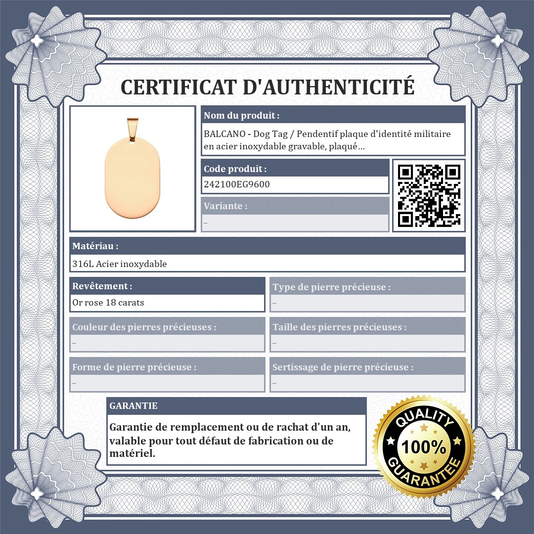 BALCANO - Dog Tag / Pendentif plaque d'identité militaire en acier inoxydable gravable, plaqué or rose 18K