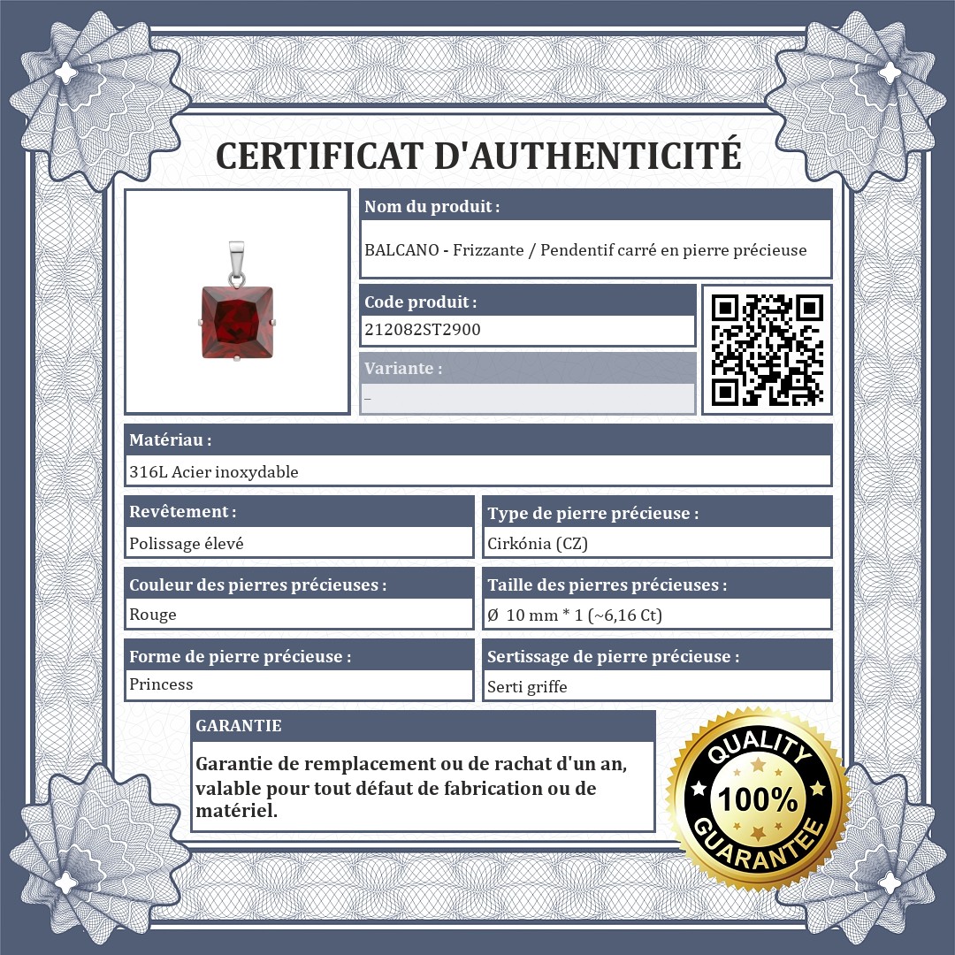 Pendentif carré en pierre de zirconium rouge grenat. Bijoux en acier inoxydable médical 316L, qui, grâce à son matériau, ne s'use pas et ne se décolore pas.