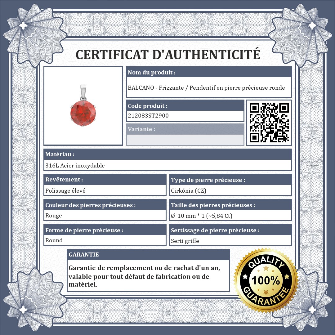 Pendentif en zirconium rond de couleur rouge grenat. Bijoux en acier inoxydable de qualité médicale 316L, qui ne s'usera pas et ne se décolorera pas grâce à son matériau.