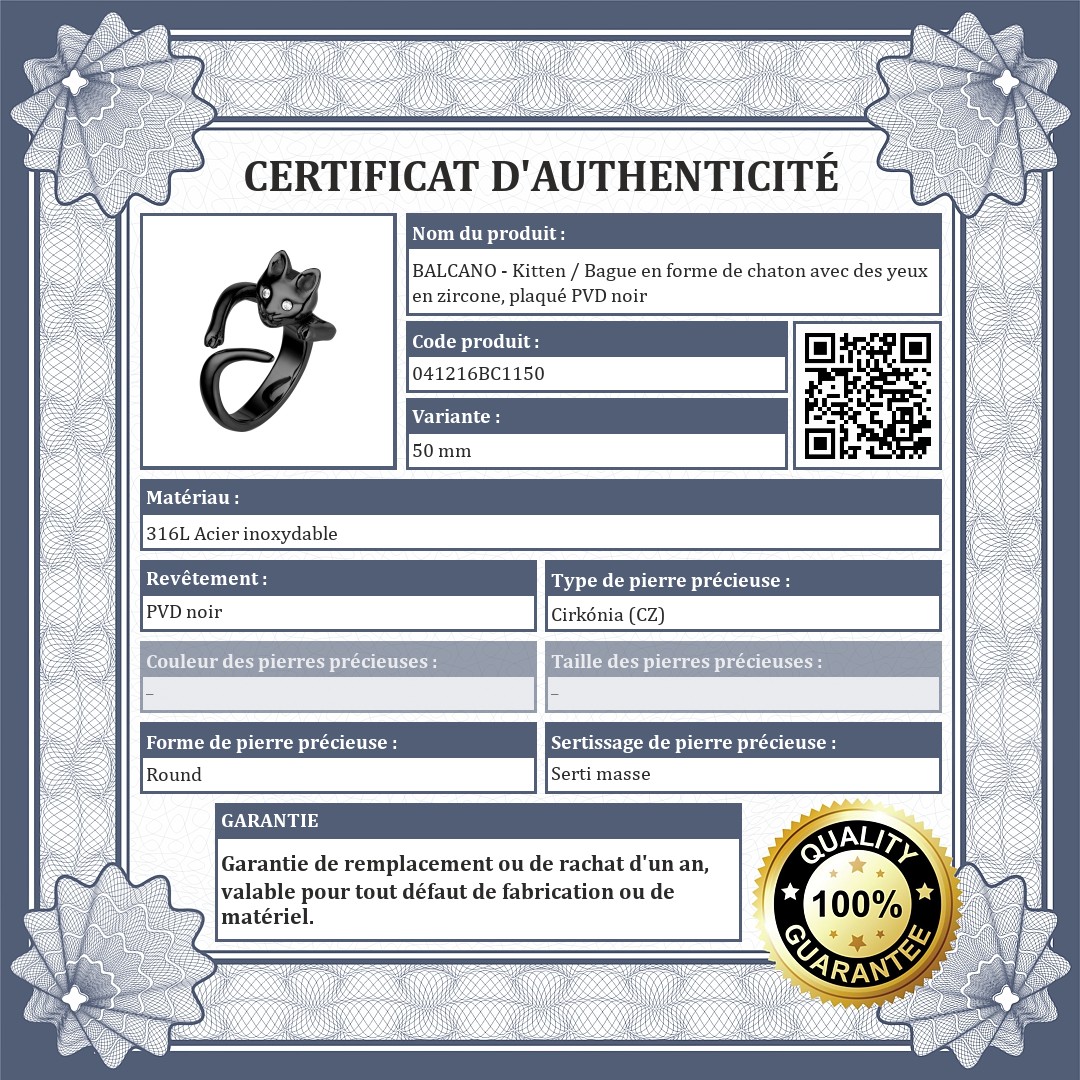 BALCANO - Kitten / Bague en forme de chaton avec des yeux en zircone, plaqué PVD noir