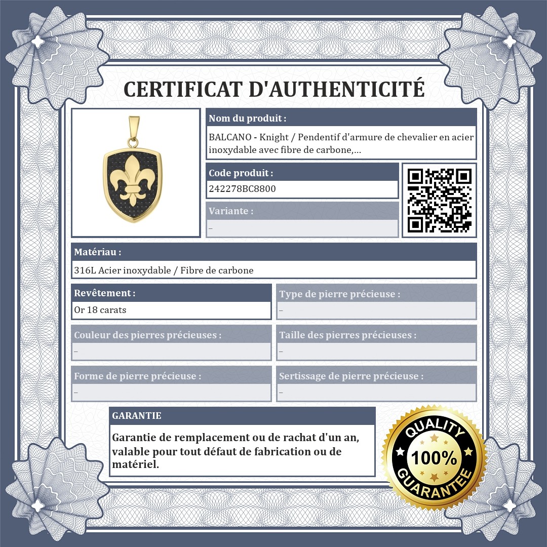 Pendentif en forme d'armure de chevalier avec un motif de lys traditionnel et une incrustation en fibre de carbone. Fabriqué en acier inoxydable médical 316L et plaqué or 18K. Un favori des guerriers dans l'âme. Le matériau est hypoallergénique, non abrasif et ne s'effiloche pas.