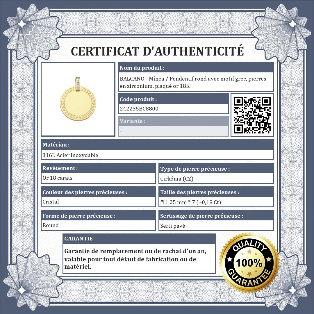 Pendentif rond en acier inoxydable 316L médicale, plaqué or 18K. Le pendentif est décoré d'un motif grec incrusté sur le pourtour et l'oreille du pendentif est ornée de pierres de zirconium rondes et transparentes étincelantes.