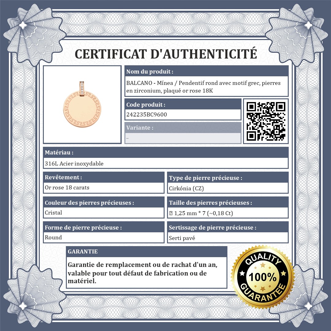 Pendentif rond en acier inoxydable 316L médicale, plaqué or rose 18K. Le pendentif est décoré d'un motif grec incrusté sur le pourtour et l'oreille du pendentif est ornée de pierres de zirconium rondes et transparentes étincelantes.