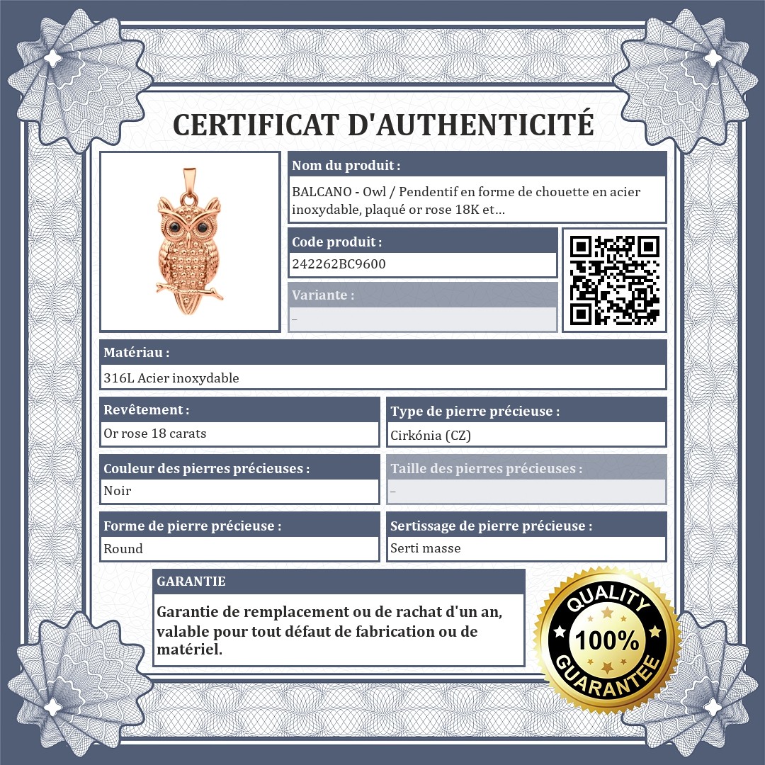 BALCANO - Owl / Pendentif en forme de chouette en acier inoxydable, plaqué or rose 18K et avec pierres précieuses en zir