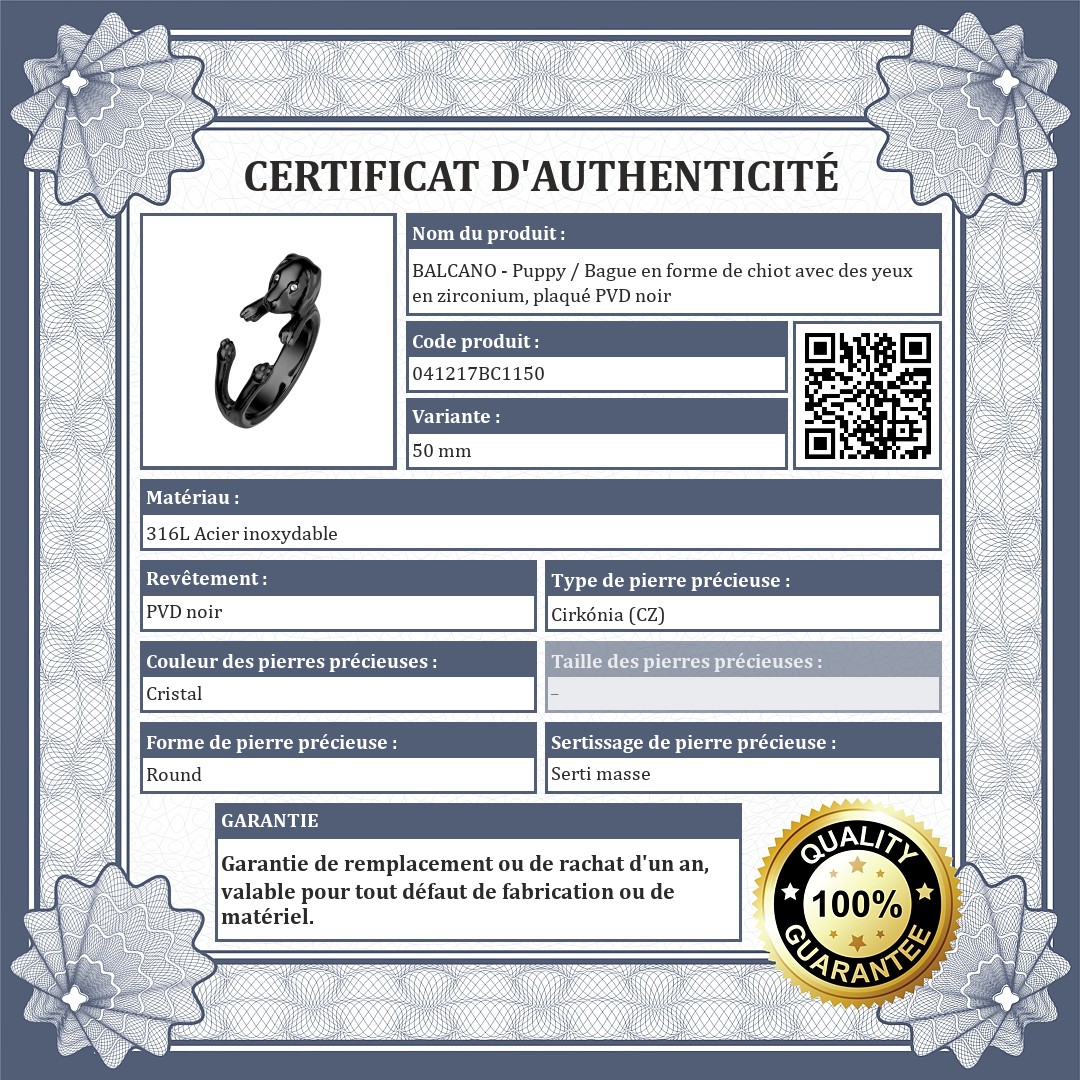 BALCANO - Puppy / Bague en forme de chiot avec des yeux en zirconium, plaqué PVD noir