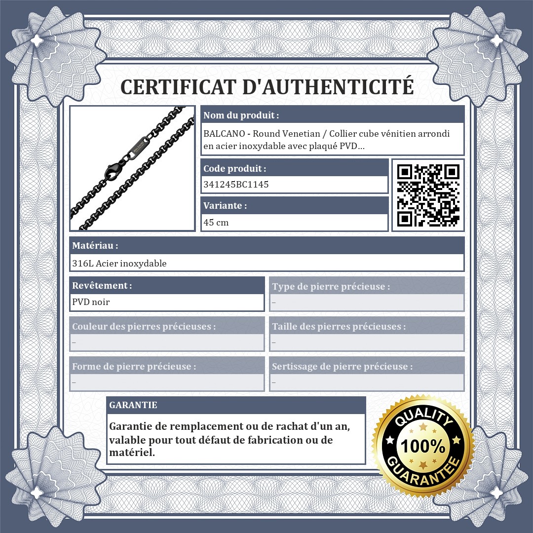 Collier de haute qualité, antiallergique, en acier inoxydable 316L, de type chaîne cube vénitienne arrondie avec plaqué PVD chromé noir. Grâce à son matériau, il ne perdra pas son éclat, ne rouillera pas et ne se ternira pas à l'usage.