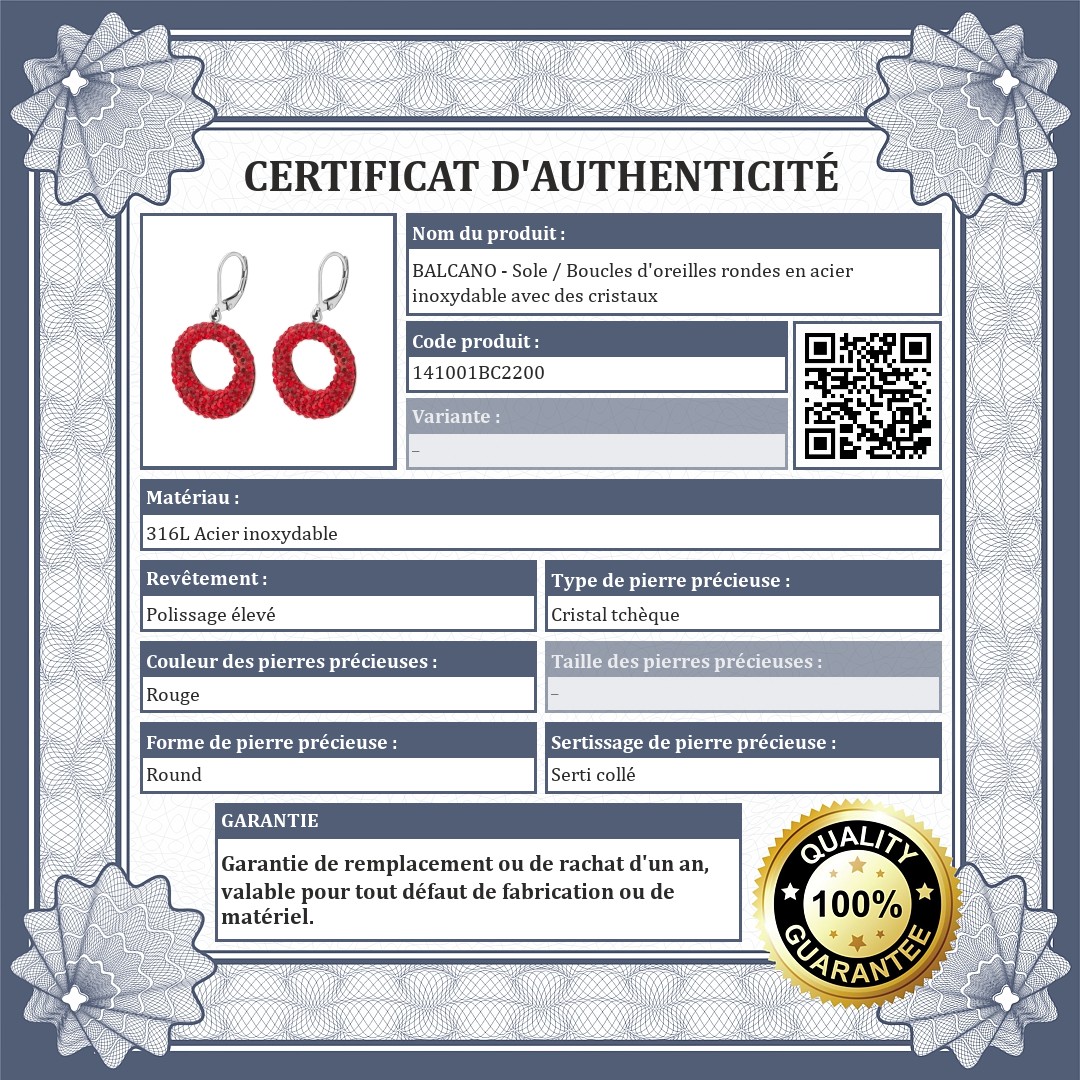 Boucles d'oreilles pendantes rondes serties de cristaux tchèques, couleur rouge. Bijoux en acier inoxydable de qualité médicale 316L, extrêmement durable, qui ne s'use pas et ne se décolore pas.