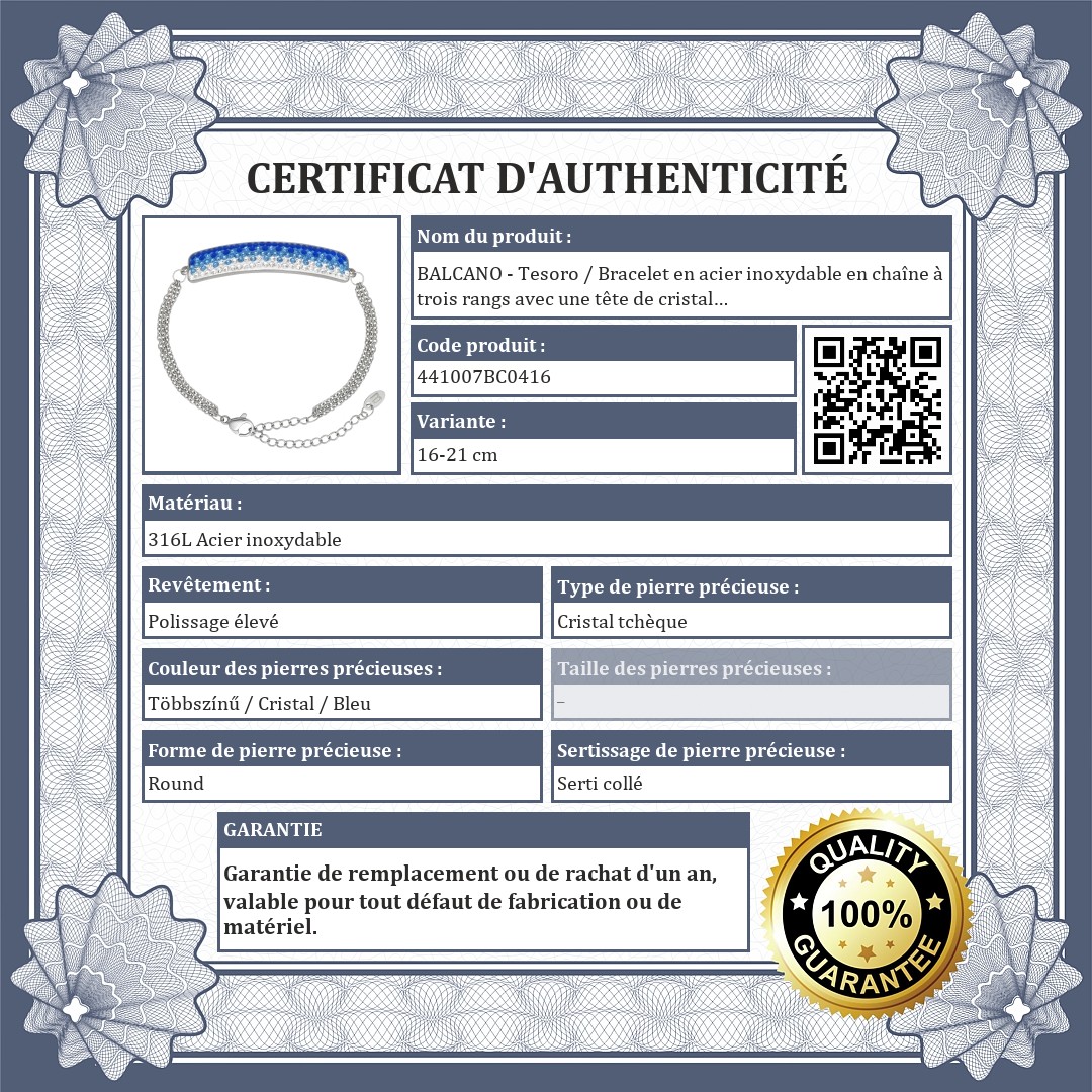 Bijoux antiallergiques, en acier inoxydable 316L, avec hautement polie. Bracelet à fermoir dauphin de taille réglable, composé de trois rangées de chaînes d'ancre aplaties. Une coiffe courbée à la mode, sertie de cristaux tchèques bleus clairs très étincelants.
